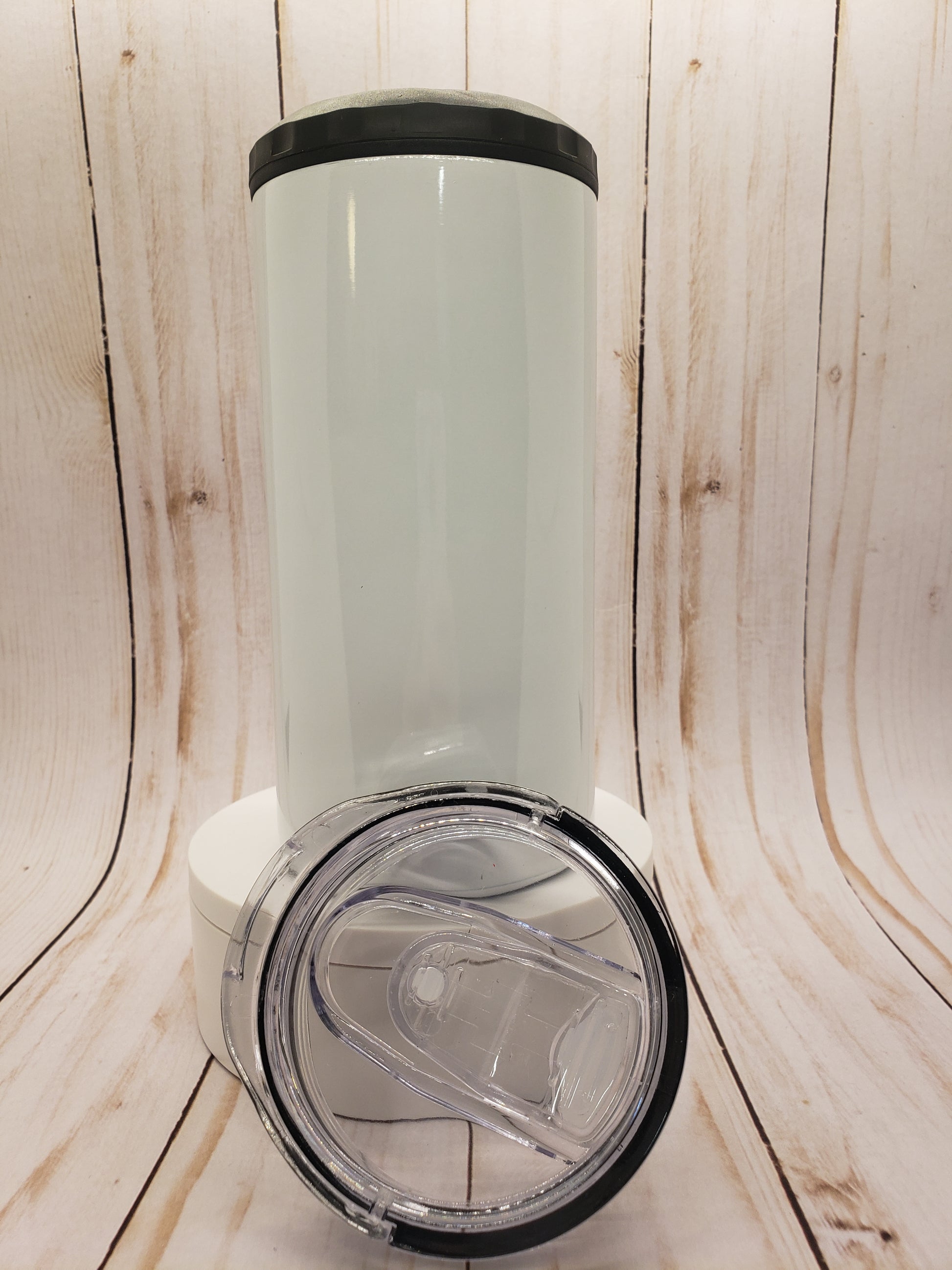 Stainless steel double walled can cooler that can fit a standard sized can, a skinny can, and a standard bottle, as well as be used as a 16oz cup with a separate sliding top lid and straw.